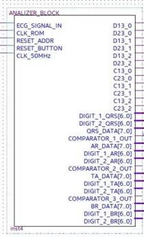 The analyzer block module windows the pulsed ECG with a time frame three pulses long and implements the procedure previously indicated in the classification section. Figure 13 and Figure 14 show elements comprising the analyzer module and its schematic, respectively. Figure 14 has been split, in lexicographical order, into three parts for the sake of visualization.