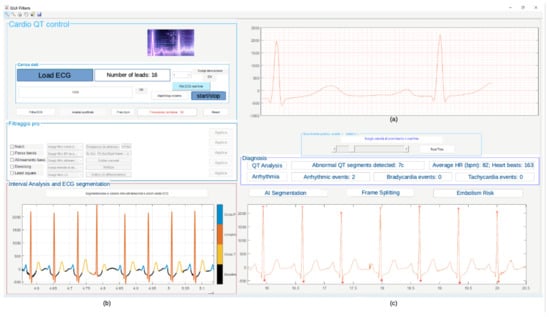 Figure 21 shows the obtained results of the simulation carried out in Matlab using record 11 of the database. The diagnosis in terms of arrhythmias, QT lengthening, and PE embolism risk is also shown. The graphical user interface (GUI) in Figure 21 has also been developed in the Matlab environment.