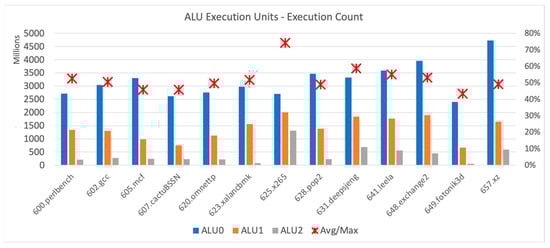 Figure 1 illustrates the distribution of processing operations among different ALUs when using the first-in, first-out (FIFO) selection mechanism for the ready-to-execute instructions. Note that ALU0 is the most utilized ALU of the three and ALU2 is the least employed, which is attributed to the fixed allocation policy of the available ALUs; a higher priority is given to an ALU with a lower index. Because ALU execution time is 1 clock cycle, all ALUs become available every cycle. Therefore, when one instruction is issued only ALU0 is allocated. In turn, for two instructions ALU0 and ALU1 are utilized, and when three instructions are issued, all ALUs are employed. Figure 1 shows that ALU0 is used at more than twice the rate as ALU1 and nearly 10 times the rate as ALU2 for most benchmarks. In such a scheduling implementation, ALU0′s worst-case switching factor dictates that the worst-case RMS-EM scenario be applied to all ALUs. Figure 1 also shows the ratio of the average number of ALU allocations to the maximum number (3). In most of the benchmarks, the measured ratio is approximately 50%, which is another indication of the major difference between the maximum number of ALUs utilized and the average number of allocations.