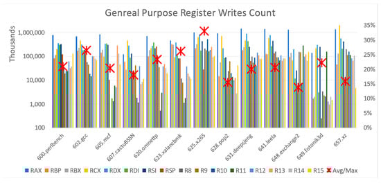 Our next set of experiments examines the switching factor in architectural registers. Figure 2 illustrates the distribution of write operations on integer general-purpose registers (GPRs) for the Spec2017 benchmarks. The distribution clearly is not uniform. For example, the RAX register is the most-toggled register in terms of write operations, whereas the nonlegacy registers are hardly used and thus are significantly less toggled than the x86 legacy registers. The root cause of these differences is the nature of compiler register-allocation algorithms. Figure 2 also shows that the ratio of the average number of write operations to the maximum number of write operations varies from nearly 7% to 33%. This measurement is another indication that the toggle rate is not equally balanced between registers, so the register with the greatest number of writes dictates the overall switching ratio for RMS-EM.