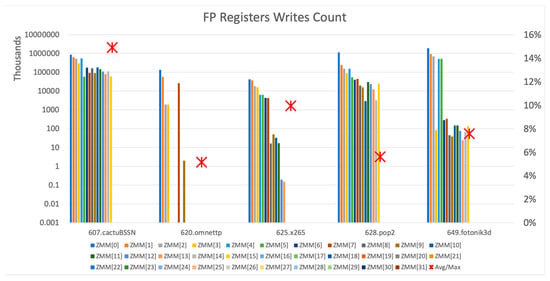 Figure 3 presents the number of write operations on floating-point (FP) registers for the Spec2017 benchmarks that involve FP operations. The results presented for this case are similar to the results presented in Figure 2. For FP registers, the number of writes is significantly greater in the registers with lower indexes (i.e., the ZMM0, ZMM1, and ZMM2 registers have the highest write count). Similar to integer registers, this can also be explained by the nature of the register-allocation algorithm of common compilers. In this case, the ratio of the average number of write operations to the maximum number of write operations is even smaller, which is indicative of an even larger variance relative to integer registers.