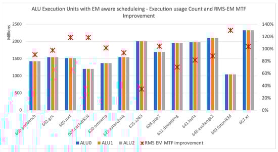 Distribution of ALU execution usage count and MTF improvement with RMS EM-aware allocation.