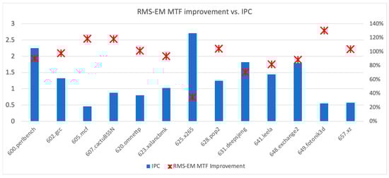 As part of this study, we also compare the instructions per cycle (IPC) versus the potential RMS-EM MTF improvement, as shown in Figure 6. Benchmarks with a small IPC have a greater potential for RMS-EM MTF improvement because of the underused ALUs that could potentially help reduce the maximum RMS-EM hotspots.