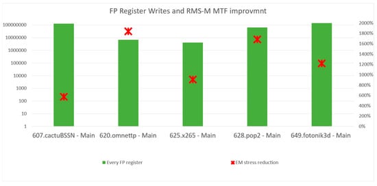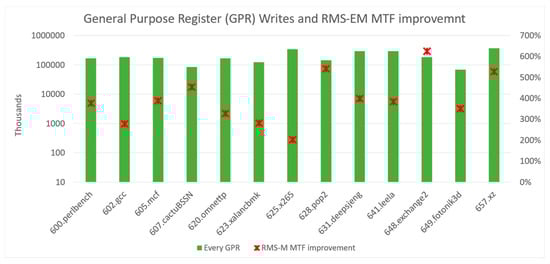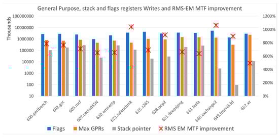 As part of the experiments, we also observed that the flags and stack-pointer registers experienced excessive stress during write operations, which makes them highly susceptible to RMS-EM. Figure 9 illustrates the number of write operations to the flag and stack-pointer registers and compares them with the maximum number of writes per register in the GPR register file. For almost all benchmarks, the number of writes to the flag register significantly exceeds those to the GPR and stack-pointer registers. This is because almost every instruction involves implicit writes to the flag register, which motivated us to extend the EM-aware scheme proposed for the GPR register file to include the flag and stack-pointer registers. Figure 9 shows that, in this case, the maximum number of write operations is reduced even more (between 80% and 90%) and that the potential MTF improvement is more than 760% on average.