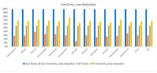 Figure 10 summarizes the reduction of the ratio of IRMS to IRMS_MAX in the design with the EM-aware architecture versus the original design for each benchmark that we used. In addition, it presents the percentage of metal nets that can leverage such RMS current reduction. The results show that, for the ALU, nearly all nets can leverage a reduction of approximately 30% in RMS current, and 55% of the RF nets experience a 68% reduction in their RMS current. Note that the metal nets that do not leverage a reduction in the RMS current already exhibited a small RMS current, so their overall improvement is not noticeable by the tool. The extended MTF as a result of IRMS reduction can be calculated using Equation (3). The extended MTF is proportional to the ratio of IRMS_MAX to the reduced IRMS to the power of two. Thus, the observed RMS current reduction offers at least a x2 and x10 lifetime extension for ALUs and register files, respectively. One may note that the extended MTF experimental results that are obtained using the RMS-EM physical simulation are similar to the MTF improvement prediction provided by the experimental results in Figure 5, Figure 7, Figure 8 and Figure 9, which were based on the switching probability reduction.