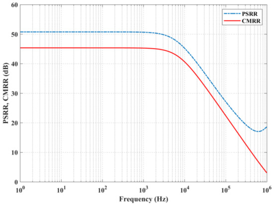 26]. It is worth noting, however, that the tail-less structure does not offer a CMRR and PSRR as high as tailed ones, but the values are still acceptable and comparable with other solutions.