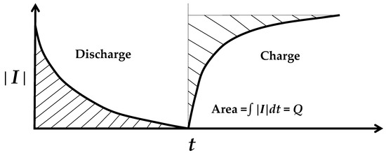 The discharge–charge behavior, as illustrated by the curve of the current magnitude (│I│) as a function of time (t) during discharge (short-circuited) and the subsequent charge (open-circuited). The shaded area gives the magnitude of charge Q associated with the discharge/charge.