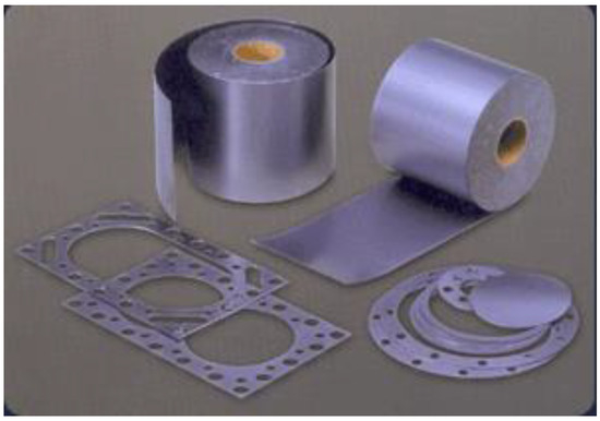 Flexible graphite commercially made by compacting particles of exfoliated graphite. http://www.mvivek.com/flexible.htm (public domain) (accessed on 5 April 2023).