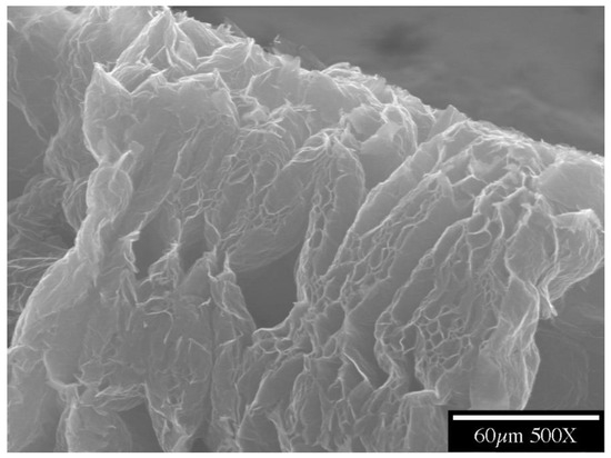 Flexible graphite is made by compacting graphite particles in the form of exfoliated graphite without a binder and is commercially available in the form of large sheets (Figure 3) [86,87,88,89,90,91,92,93,94]. Exfoliated graphite is expanded intercalated graphite, such that it has a cellular structure (Figure 4). The expansion is typically conducted by rapid heating of the intercalated graphite. Because of the cellular structure, multiple pieces of exfoliated graphite, with each piece made from a graphite flake, join by mechanical interlocking without the need for a binder.