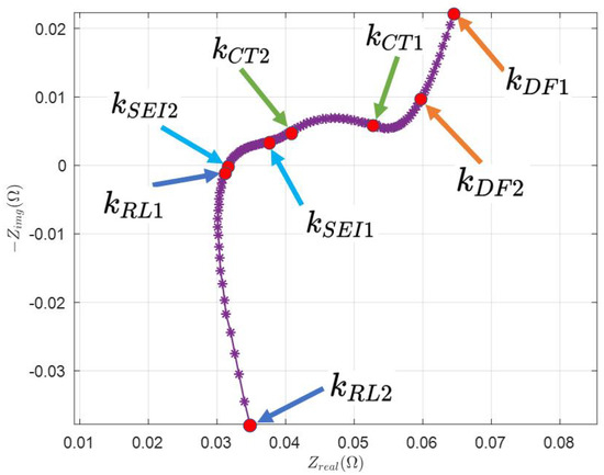 In Figure 2, the feature points are selected manually, which are indicated by index and . From Figure 1, it is clear that the measured Nyquist plot needs to be divided into several parts to see how it is directly related to the AR-ECM. Different parts of the Nyquist plot represent the battery’s impedance at different frequencies.