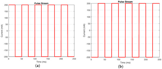 Current profile for pulse stream test. Use pulse stream A when the battery’s SOC is between and ; use pulse stream B when the battery’s SOC is . (a) Pulse stream A (frequency: 20 Hz; Duty Cycle: 50%). (b) Pulse stream B (frequency: 20 Hz; Duty Cycle: 50%).