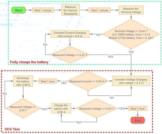 - Find the cut-off voltageTo ensure the maximum current in the CC-CV charging process below the safety limit, we need to set a conditional voltage, which should be greater than the cut-off voltage to decide when to start the CC or CV charging; the cut-off voltage can be written as:From Table 1, the internal resistance of the LG battery is less than 40 m, and the internal resistance of the Molicel battery is less than 15 m. The maximum current = 4.2 A, and the maximum voltage = 4.2 V. Therefore, in the OCV test, we set the conditional voltage = 4.1 V for LG batteries and = 4.15 V for Molicel batteries.