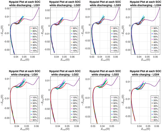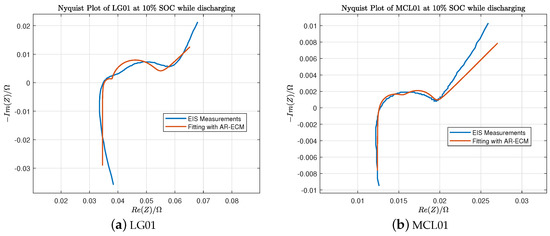In Table 3, Table 4, Table 5 and Table 6, the estimated ECM parameters for LG and Molicel batteries are obtained using the algorithms explained in Section 2. We can observe that the internal resistance measured by Arbin is quite close to the ohmic resistance . Furthermore, Figure 9a shows the fitted Nyquist plot of LG01 battery at SOC while discharging, and Figure 9b shows the fitted Nyquist plot of MCL01 battery at SOC while discharging.