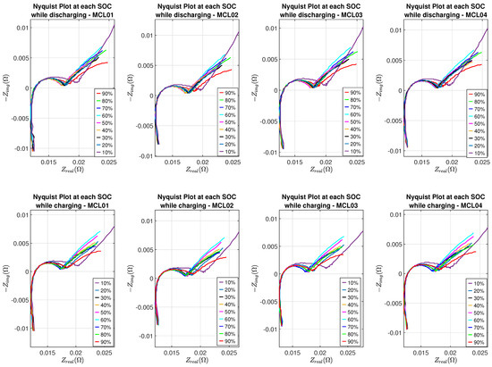 Nyquist plots of eight batteries at different SOC levels are shown in Figure 7 and Figure 8, where the SEI effect can be seen clearly in the Nyquist plot corresponding to 10% SOC while batteries are in the discharging or charging process.