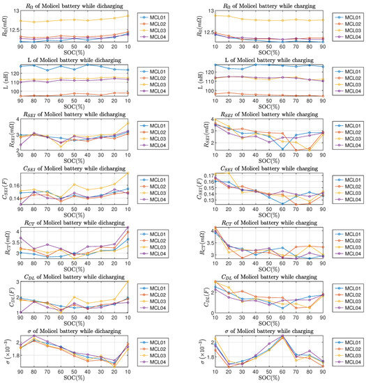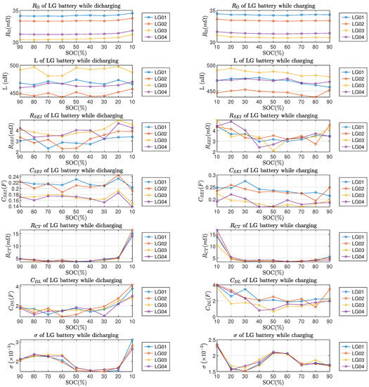 From Figure 10 and Figure 11, it can be observed that the ohmic resistance , charge transfer resistance and double-layer capacitance all reached the highest value at SOC; this phenomenon applies to both LG and Molicel batteries. The Warburg coefficient of LG batteries reached the highest value at SOC; as for Molicel batteries, the highest occured at while discharging and while charging. In addition, no regularity can be found in LG and Molicel batteries with respect to the variations of L, and at the SOC level; also, the variations of all ECM parameters between and SOC are not significant in general.