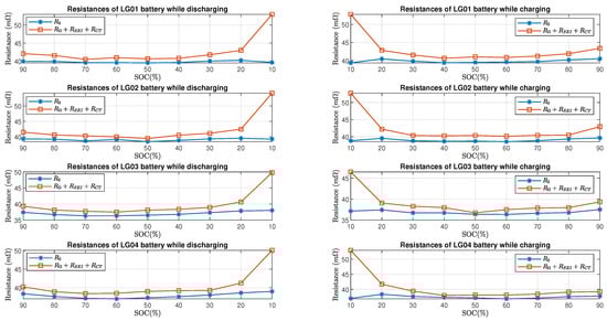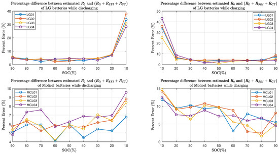 Furthermore, Figure 15 shows the percent error of the estimated resistive elements with respect to the internal resistance in the charging and discharging process. As for LG batteries, it can be seen that the percent errors are within when the batteries’ SOC is between and while charging or discharging; at SOC, the percent errors are between and in the discharging process, and they are between and in the charging process. As for Molicel batteries, when the SOC is between and , the percentage errors are within while discharging and are within while charging; at SOC, the percentage errors are between and in the discharging process, and they are between and in the charging process.