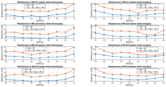 Figure 12 shows all the estimated internal resistance using the time domain approaches presented in Section 3. It can be seen that at , both LG and Molicel batteries’ internal resistance declined to the lowest value, whereas at SOC, all the Molicel batteries’ internal resistance reached the highest value.