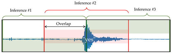 The deployment of the trained DL model onto the MCU is done with the help of the TensorFlow lite for Microcontrollers library available as C++ source code. The complete library has a code memory footprint of about 480 kB, yet including only the required subset to run inferences on our model, that footprint drops to only 80 kB. Data preprocessing (i.e., calculation of spectrograms) is easily ported to MCU since it was coded for that purpose in the first place. Yet, samples are now streamed from the microphone through the DFSDM/DMA hardware pipe. As explained earlier, an FFT is processed every 128 collected samples, resulting in 65 bins. By dropping five bins representing noise at low frequencies, a spectrogram column is obtained. After 61 repetitions of this process, the spectrogram is forwarded to the inference engine. The prediction result is finally encoded and stored in RAM, waiting to be written on the SD-card.