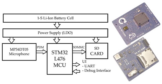 Figure 3 shows the hardware architecture of the audio logger. It is a minimalistic architecture designed around off-the-shelf electronic components with a low-power microcontroller that streams audio samples from a MEMS-digital-integrated microphone to an SD-Card.