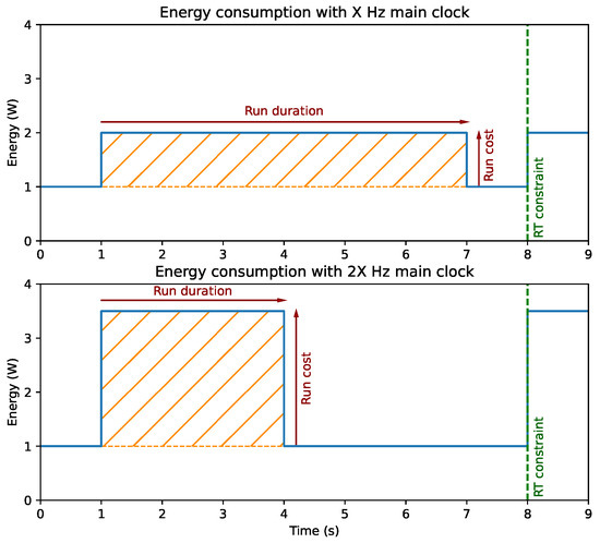 In the upper scenario, the main clock is set to an arbitrary frequency of X Hz. At t = 1 s, the system awakens from its sleeping state and starts processing data for six ss. Upon completion, the system returns to sleep until the next Real-Time (RT) constraint for one second. In Figure 4, the orange-hatched area represents the energy overhead associated with the processing: R u n d u r a t i o n × R u n c o s t = 1 × 6 = 6 W.s (or approximately 1.7 mW.h). In the lower scenario, the clock speed is doubled to 2X Hz. Under this new condition, the same task sees its processing duration halved. However, in this case, the processing energy overhead is 2.5× 3 = 7.5 W.s, worsening the logger autonomy.