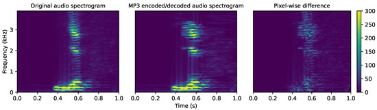 Figure 6 presents the effect of encoding/decoding on a 1s-long audio clip containing a ’yes’ keyword. The first panel represents the spectrogram computed from an original, uncompressed audio clip. The s spectrogram is obtained after applying MP3 encoding and decoding on the same clip. Differences in so-obtained spectrograms are better revealed on the third panel (pixel-wise subtraction).