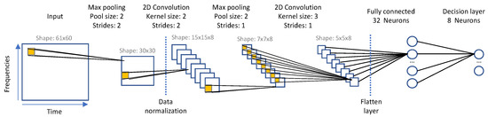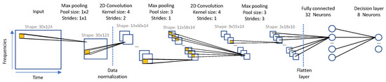 The sheer amount of input data has a linear impact on the total inference time. Therefore, the earlier the data dimension is reduced in the process pipe, the stronger the impact on execution time. A computationally effective way to reduce dimension in audio classification tasks is to apply a pooling strategy [28]. Here, an aggressive version of this strategy is implemented using a 2 × 2 subsampling layer applied directly to the input data, with no overlap. This is a simple dimension reduction mask that keeps the maximum pixel over an area of four, thus reducing the spectrogram picture to 30 × 30 pixels. Next, the normalization layer is included to prevent overfitting. This layer has a very small impact on inference time (less than 1%). In the original LeNet-5 model, the first convolutional layer uses a 3 × 3 kernel with a stride of 1. Instead, we used a 2 × 2 kernel with no overlap (i.e., strides = 2). This combination accelerates calculations by a factor of nine on this single layer and reduces output dimensions for all subsequent layers. The price to pay is a drop in accuracy that remains within specifications. The following layers, including the s 2D convolution layer, the fully connected 32-neuron layer, and the final decision layer (eight neurons), are inspired by the LeNet-5 model with sizing driven by accuracy. Quantizing these parameters to 8-bit integers is a common practice when targeting resource-limited MCUs, as it allows for both RAM usage reduction and faster computing. In our case, the Cortex-M4 CPU features a hardware Floating Point Unit, making the calculation no slower with real numbers [38]. In addition, we measured a loss in accuracy of 13% when using 8-bit quantized weights. This is not surprising considering the aggressive simplifications performed on the model. For these reasons, the initial floating-point representation of model parameters was retained.