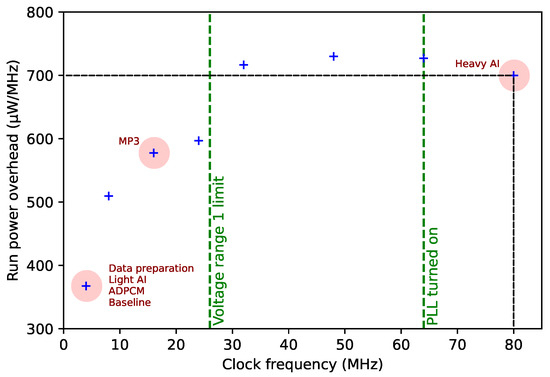The CPU clock frequency can be freely and dynamically adjusted to the most energy-efficient speed as long as RT constraints are met, e.g., in this example, the processing is completed by t = 8 s. Since clock frequency and processing time are proportional, energy efficiency is achieved when the ratio between run cost and clock frequency, i.e., energy spent per Hz, is minimized. We measure this ratio in our application for each clock speed ranging from 4 MHz to 80 MHz. Subsequently, each configuration presented in this paper runs at the most energy-efficient available speed. In the case of the baseline application, since little processing is required, the lowest frequency is selected.