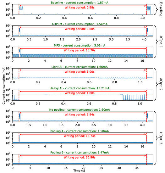 Higher current peaks correspond to SD writing events. In a previous study [4], it was observed that SD writing power efficiency improves when large data chunks are stored at once. Therefore, data are always buffered prior to SD writing, with a constant buffer size of 30 SD sectors (15 kB). This buffer is the same for all scenarios, therefore the period between writing events directly depends on the data reduction ratio. In the case of the baseline application, very little CPU energy is required to manage buffers between writing events that occur every 0.98 s.