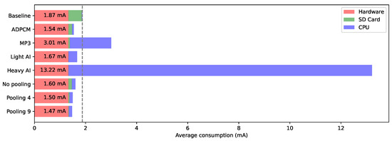 Figure 11 summarizes the logger average power consumption for each scenario. From left to right, uncompressible onboard hardware contribution, including power regulation stages, microphone, and audio data buffering is displayed first (red). Then comes the data storage cost (green), and finally the CPU overhead (blue).