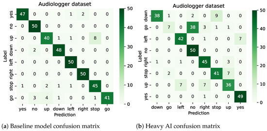 Figure 12. Confusion matrices comparison on audiologger dataset for both baseline model and heavy AI.