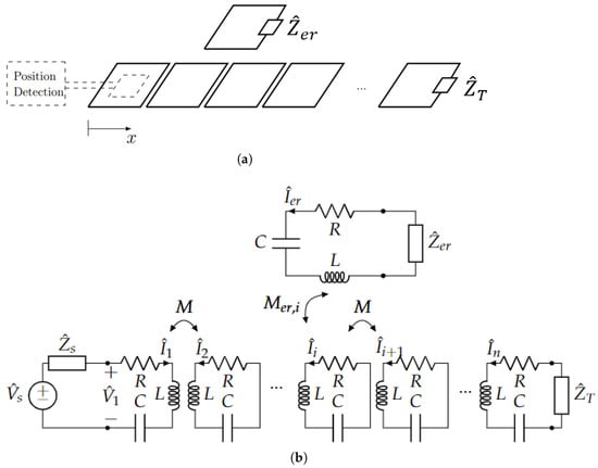 The system presented in this paper is composed of a resonator array with an additional resonator over it (moving or standstill) as is schematically illustrated in Figure 2a. The position of the moving resonator along the array is identified with the variable x. The array is composed of n identical and equally spaced coils along x, so that the mutual inductance M between each pair of adjacent coils is the same and all cross couplings between nonadjacent cells are neglected, according to the so called “nearest-neighbour approximation” [24]. The coils feature a resistance R and a self inductance L and resonate with a series-lumped capacitor of capacitance C at the frequency . In order to minimise ohmic losses occurring in the windings, the coils are usually designed with a large cross section which, at the same time, provides a large quality factor Q. We see at the end of Section 3 that an excessively large factor of merit should be avoided and that input impedance curves are better distinguished with lower Q values.