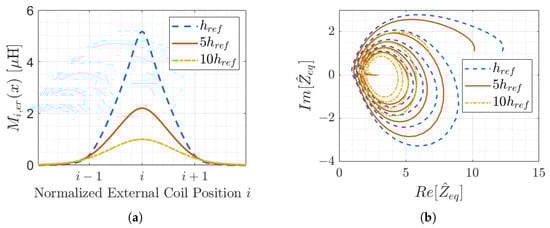In general, the sensor can operate for any vertical distance h of the external coil (with respect to the array of resonators) as long as this is coupled with the facing cells of the array. Specifically, the mutual inductance between the external coil and the array resonators must differ from zero. However, for different h values, the function may present different values (even if the behaviour is the same), and it is necessary for the current measurement system on the first resonator to work adequately. In Figure 5a, the mutual inductance between the ith array resonator and the external coil is plotted as a function of the (normalised) positions x for different vertical distances. For a fixed position, the mutual inductance value decreases as the distance between the external coil and the array increases. As a consequence, the input impedance function is “less affected” by the presence of the external resonator and its value changes.