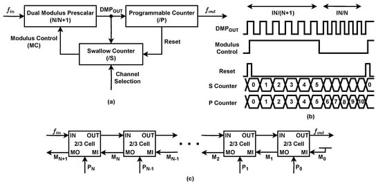 Figure 1a illustrates the design and working of the programmable counter-based divider. It is made up of a programmable counter (PC), a programmable swallow counter (SC), and a dual-modulus prescaler (DMP). When the modulus control signal (MC), which is produced by the programmable swallow counter, is 0 and 1, the is configured to be N and , respectively. The timing diagram of the pulse-swallow counter is shown in Figure 1b. A prominent MMD structure is shown in Figure 1c. The operation of a pulse-swallow counter is as follows.