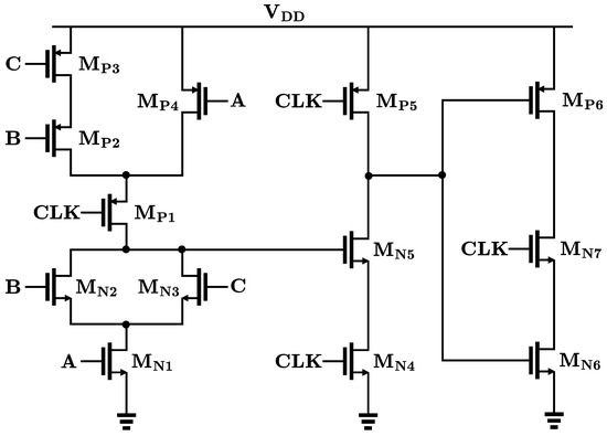 In this work, the cells are implemented using TSPC logic. The combinational logic, except for an inverter, is incorporated inside the flop to lessen propagation delay and current consumption [25]. The TSPC flop structure is shown in Figure 6. The flop is built as a single circuit that includes the conventional D-flip–flop, gate, and gate. The main advantage of this structure is that it requires only single input and produces peak-to-peak output, because of which the intermediate buffer stages are not required. The ER-MMD design is simulated in UMC 65-nm CMOS. The TSPC-based MMD works up to 6-GHz across process, voltage, and temperature (PVT). This means a maximum of eight MMD sets can be incorporated, proving a division range from 2 to 511.