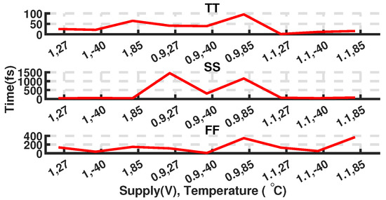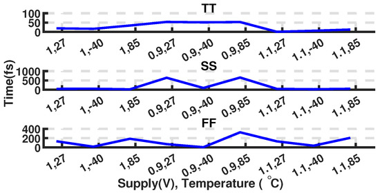 The current consumption, rise time, and fall time of the ER-MMD are summarized for three process corners, viz., slow–slow (SS), fast–fast (FF), and typical–typical (TT). For each of the three process corners the current consumption, rise time, and fall time of the MMD output was simulated for three temperatures, viz., , , and , and three voltages, viz., V, 1 V, and V, which is actually supply voltage variation.