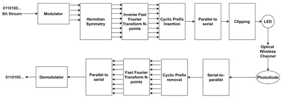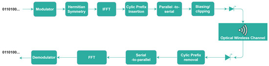 In general, the OFDM-based modulation technique for optical wireless communication is depicted in Figure 1. In the transmitter, the modulator block receives a bitstream of information and proceeds to generate symbols of complex values, which is denoted as , where for subcarriers.