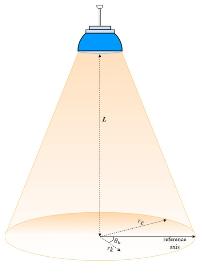 The LED is at a height of L from the ground, and the coverage area is circular with a radius ; this form is also called attocell. Assuming there are K users within an attocell, then the position of the k-th user can be denoted in the polar coordinates by , where is the user’s distance from the LED horizontally and is the polar angle with respect to the reference axis.