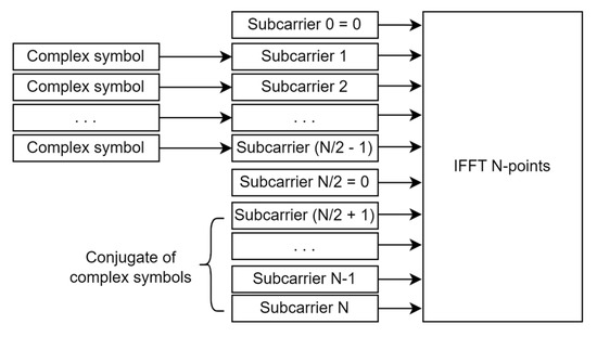 The subcarrier arrangement and Hermitian symmetry for N-point IFFT are depicted in Figure 4. The modulator block generates complex symbols, for . The complex symbols and those conjugates fill N subcarriers while 0 th and (N/2) th subcarriers are set to zero, so the frame structure becomes: