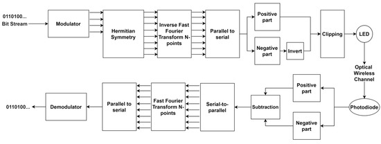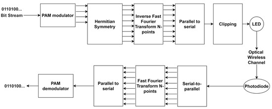 Direct Current-biased Optical Orthogonal Frequency Division Multiplexing (DCO-OFDM) is the most conventional technique of optical OFDM [35]. It is widely used in VLC and also LiFi due to its simplicity and high spectral efficiency [26,36]. The block diagram of DCO-OFDM is shown in Figure 3. In the transmitter, a bit stream of information is mapped into complex-valued symbols, and then, Hermitian symmetry is applied to produce a real signal.