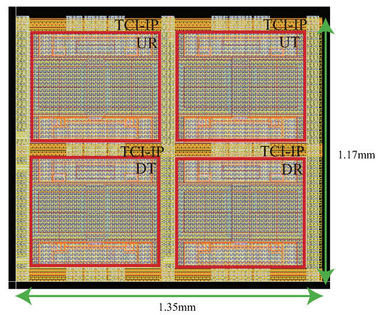 By stacking a group of chips equipped with the set of four TCI IPs as described above, with the upper chip’s DT aligned with the lower chip’s UR, and the upper chip’s DR aligned with the lower chip’s UT in the vertical direction, a data communication mechanism is established in the upward direction (UT→DR) and downward direction (UT→DR), creating a bidirectional linear network [15] (Figure 5). Additionally, the intermediate chip in the stack can have one side exposed on the surface, allowing for bonding. However, it is important to note that compared to regular chips, the number of I/O pins is limited in this stacking method, which is a limitation of this stacking technique.