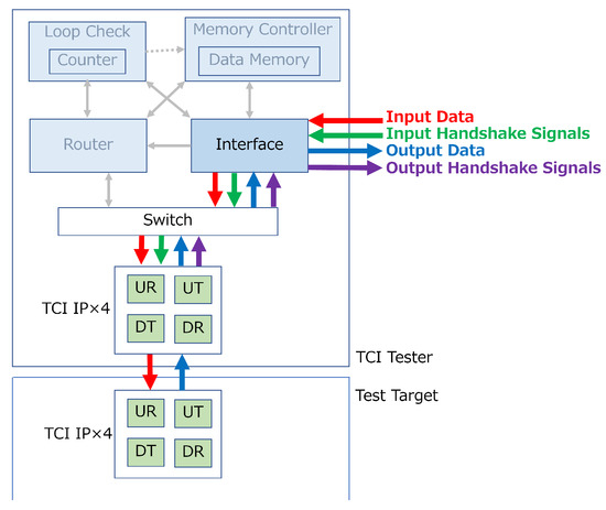 This is a mode for verifying the operation of the TCI itself. Verification is performed by directly controlling the handshake signals for TCI communication introduced in Section 2.4 and directly transferring data. Figure 9 shows the data flow in RAW mode. Red and green arrows represent incoming data and handshake signals, respectively. These are fed into each TCI IP directly from an external FPGA board or signal generator. The blue and purple arrows in Figure 9 represent the flow of data and handshake signals outputted from the TCI Tester, respectively. Observing and recording the signal sent by the TCI of the Test Target by FPGA or digital analyzer is possible.