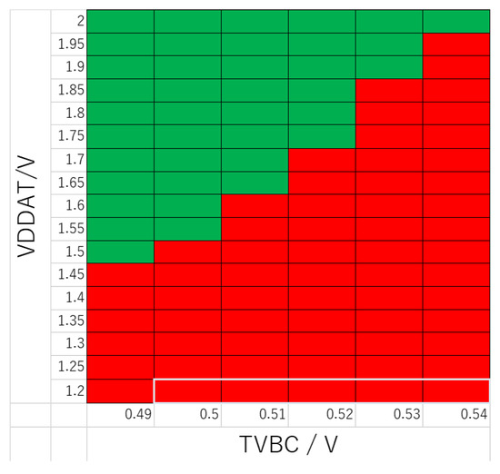 Table 5 shows various voltage values except for VDDAT and VDDAR in the experiment using TCI Tester and SMTT. For IRXBIAS1/2, the same current values as in Table 3 are used. As for TVBC, we should have experimented with the same voltage values as in Table 3 or Table 4, but when TVBC was moved from 0.7 V even a little, the data transfer of the actual chip did not work. Therefore, we fixed TVBC at 0.7 V and examined the operating range for VDDAT and VDDAR. Figure 19 shows the operating range for data transfer from TCI Tester to SMTT. The meanings of the green, red, and yellow cells are the same as in Figure 16. Transfer from TCI Tester to SMTT could be confirmed in the same voltage range as other chips, but data transfer from SMTT to TCI Tester could not be confirmed. This is because the two boards that were mounted did not work. As in Section 4.2.1, we experimented with other parameters such as VDD, VCCQ, VDDH, and IRXBIAS1/2, but there were no cases where the values in this paper were better.