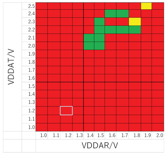As in Figure 11, green cells represent locations where normal data transfer without data corruption occurred, and red cells represent locations where data could not be transferred or where data corruption occurred. Yellow cells indicate locations where normal data transfer is possible but sometimes not. The light blue line surrounds the cell when both VDDAT and VDDAR are the design voltage of 1.2 V.