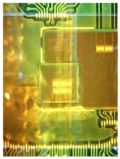 We stacked the TCI Tester on top of the coarse-grained reconfigurable accelerator CC-SOTB2 [18] and set the TCI Tester to RAW mode to verify the operating range. As for TVBC, the data transfer of the actual chip did not work unless it was 0.42 V, which is outside the standard voltage range. Therefore, the value of TVBC was fixed at 0.42 V, and the VDDAT and VDDAR of both chips were varied. As shown in Figure 15, CC-SOTB2 is a rectangle of 3 mm × 6 mm and has the same 2 × 2 IPs at the same positions as the TCI Tester and the IP positions match the TCI Tester. The bonding wires are removed from the chip stack’s bottom edge.