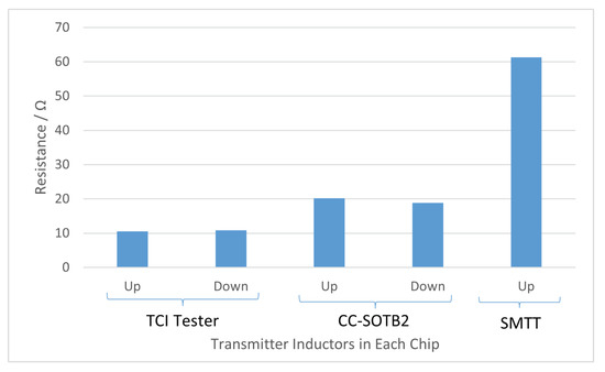 As mentioned earlier, the above cause is thought to be related to the position of the TCI IP power input pad. Figure 20 shows the results of analyzing the resistance of the power supply grid on the transmission side of each chip from the layout data. We used Silicon Frontline Technology’s P2P/RMAP [22] for the analysis. Resistance values are from each power pad to the IP power feed point. In this graph, for TCI Tester and CC-SOTB2, the wiring resistance values of the upward and downward transmission inductors are shown. Also, regarding the SMTT, the wiring resistance value is shown because it is the chip stacked at the bottom and the inductor exists only in the upward direction.