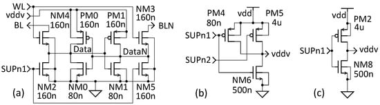 The 8T PUF cell shown in Figure 1a stems from conventional 6T-SRAM [51]. Four transistors, namely PM0, PM1, NM0 and NM1, make up two cross-coupled inverters for storing data. The unique PUF readings predominantly come from the threshold voltage mismatch among these transistors. After powering up, the mutual input and output nodes, i.e., Data and DataN, both reach a metastable state [52], at which time the outputs of two cross-coupled inverters are lingering between logical ‘0’ and ‘1’, then cross it and settle in one of these stable states. NM4 and NM3 are access transistors. They connect the internal nodes Data and DataN to bit lines BL and BLN. In addition, two NMOS transistors NM2 and NM5 are designed to rapidly discharge the Data and DataN nodes during the reset stage with both SUPn1 and SUPn2 signals asserting. As a result, the reset time can be shortened by 5 orders of magnitude, i.e., from 120 microseconds to 1 nanosecond, hence facilitating high-rate PUF evaluation. Furthermore, no data remanence can be exploited by attackers [53,54]. The PUF layouts were implemented symmetrically. During the evaluations, it is shown that a tiny bias of layout influences the proportion of the ones and zeros of the PUF readings. With two additional transistors, the area cost of the 8T PUF is 13.2% more than its 6T-SRAM PUF counterpart, which was implemented for comparison as shown in Figure 4.