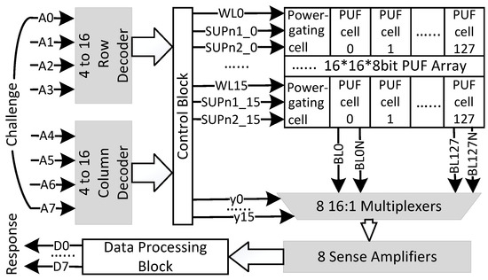 An example architecture of a power-gated PUF array is illustrated in Figure 2. This architecture consists of some general SRAM function blocks in grey, a 2 kilo-bit power-gated PUF array and two functional blocks, i.e., a Control block and a Data Processing block. The two function blocks will be implemented and evaluated in due course.