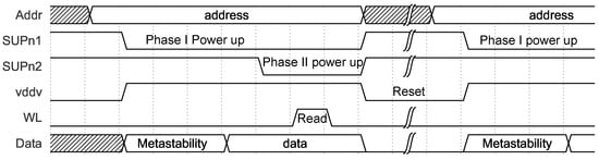 - Control block: The switching activity is controlled by the Control block. Apart from passing the decoded higher 4-bit address to choose an 8-bit word from 16:1 multiplexers, it generates SUPn1, SUPn2 and WL (Word Line) signals from the decoded lower 4-bit address. Once a PUF row is chosen by the lower 4-bit address, the SUPn1 signal is discharged to ‘0’ to switch on the power supply. After Data are settled down, the SUPn2 will be discharged to ‘0’, and WL will be asserted to ‘1’ in sequence for a reading process. Then, in the Reset stage, both SUPn1 and SUPn2 signals are asserted to ‘1’. There will be no power supply to the PUF cells, and the data will be discharged to ‘0’. The protocol of the two-phase power gating method is shown in Figure 3.