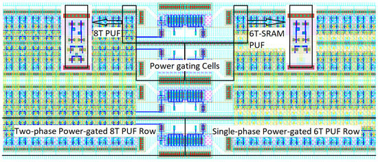 The design is implemented with UMC 65 nm technology. The layout of one test circuit is partly illustrated in Figure 4. It includes rows of two-phase power-gated 8T PUFs on the left-hand side and rows of single-phase power-gated 6T-SRAM PUFs on the right-hand side for comparison. Each row has 128 PUF cells.