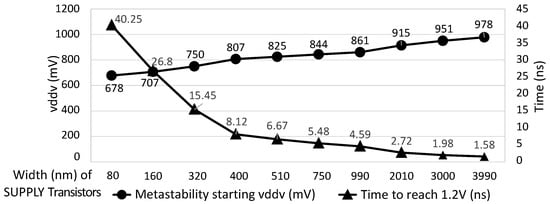 For two-phase power gating, the phase one SUPPLY transistor PM4 must be small enough to prolong the metastability process. Meanwhile, the phase two SUPPLY transistor PM5 should be large enough to supply power to 128 PUF cells quickly. As presented in Figure 5, there is a roughly linear relationship between the SUPPLY transistor width and the approximate value of the vddv plateau while metastability resolves. There is also a nearly quadratic dependence between the SUPPLY transistor width and the time duration for vddv to reach 1.2 V or the metastability resolving time duration. Hence, by varying the size of the SUPPLY transistor, the metastability resolving time can be manipulated.